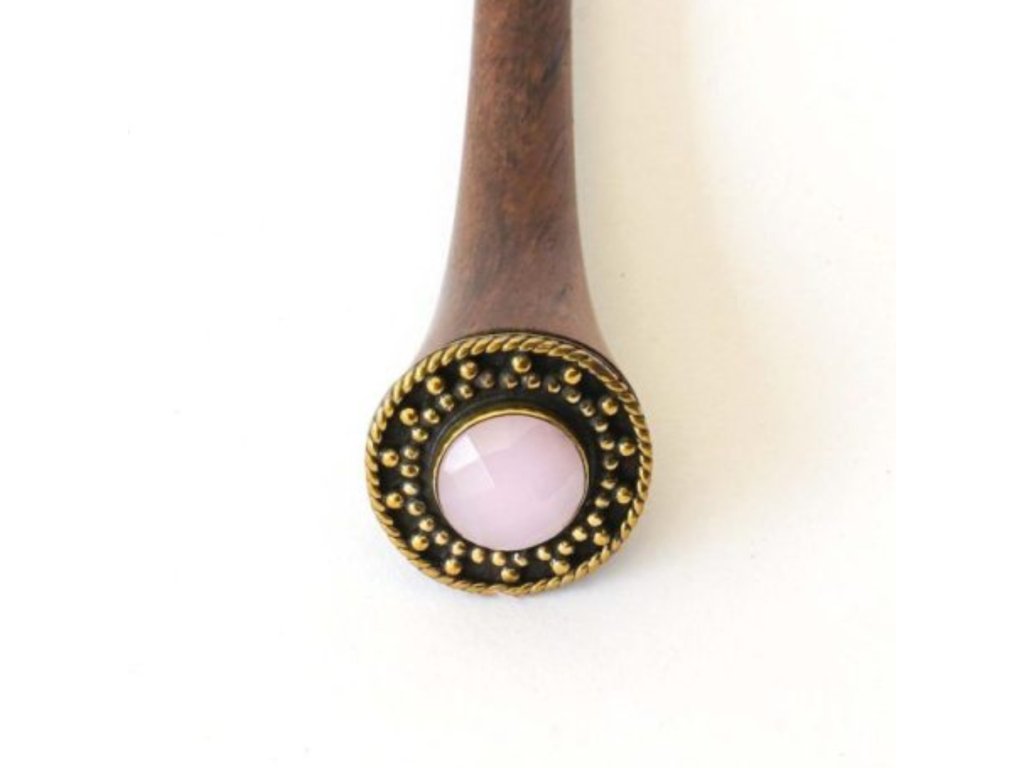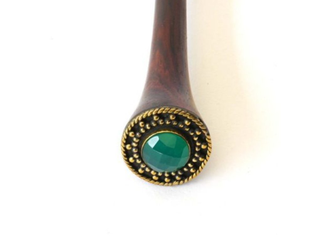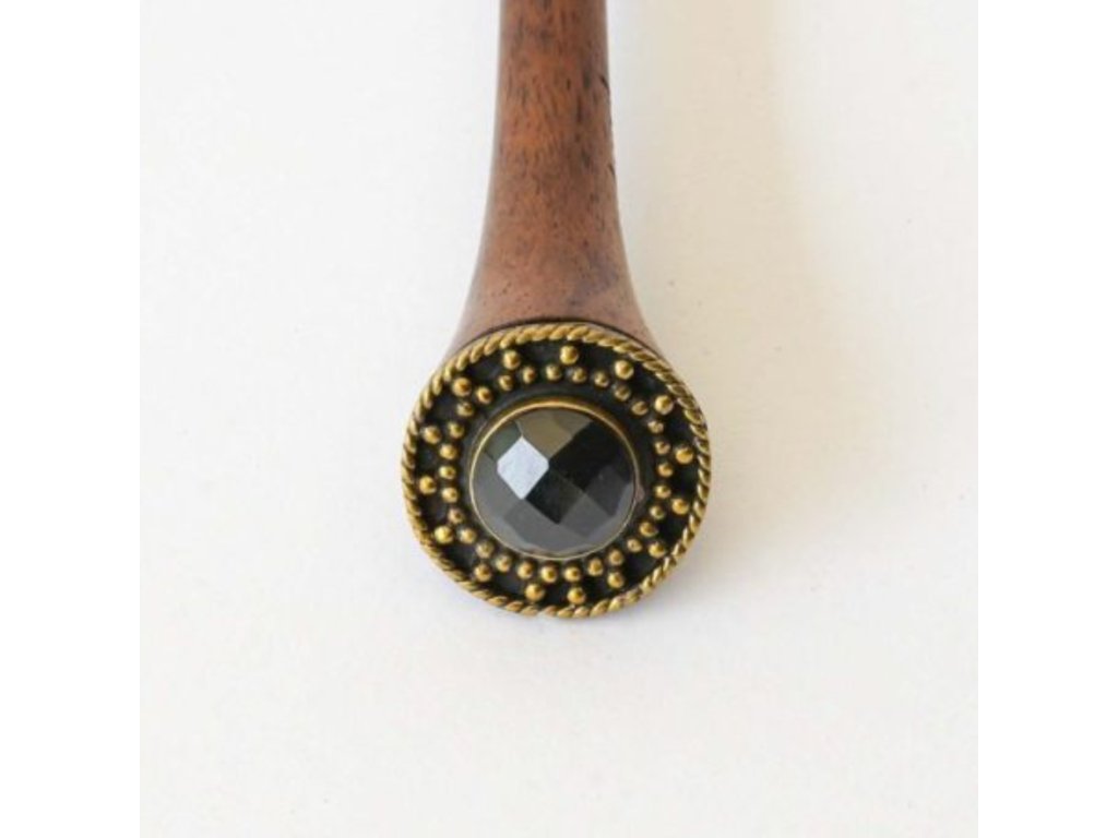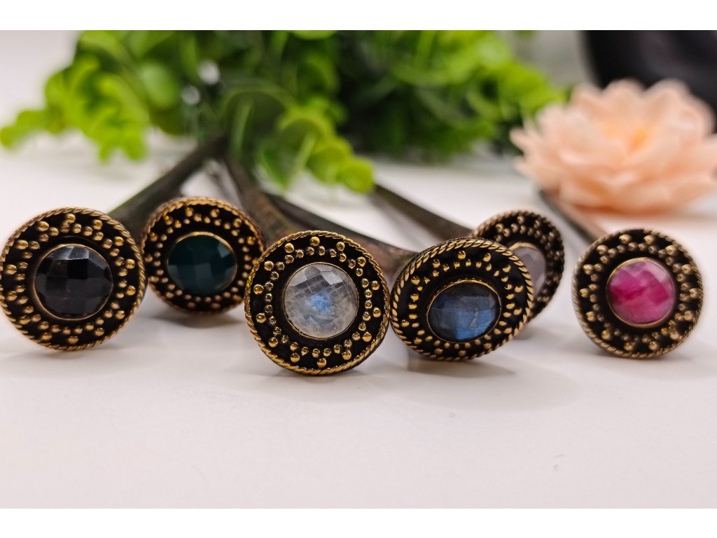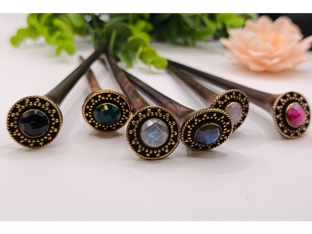 Ozdoba vyrobená z ručne opracovanej mosadze drží fazetovaný kameň, ktorý jemným a magickým spôsobom zachytáva svetlo. Ako malý talizman ukrytý vo vlasoch.