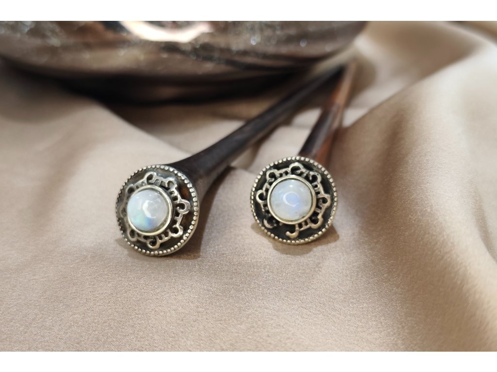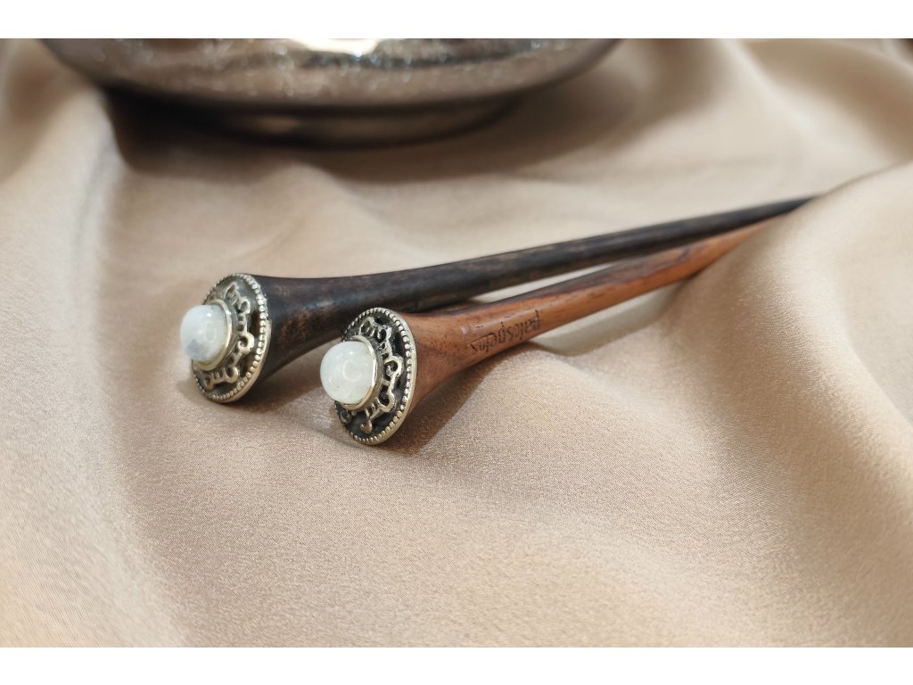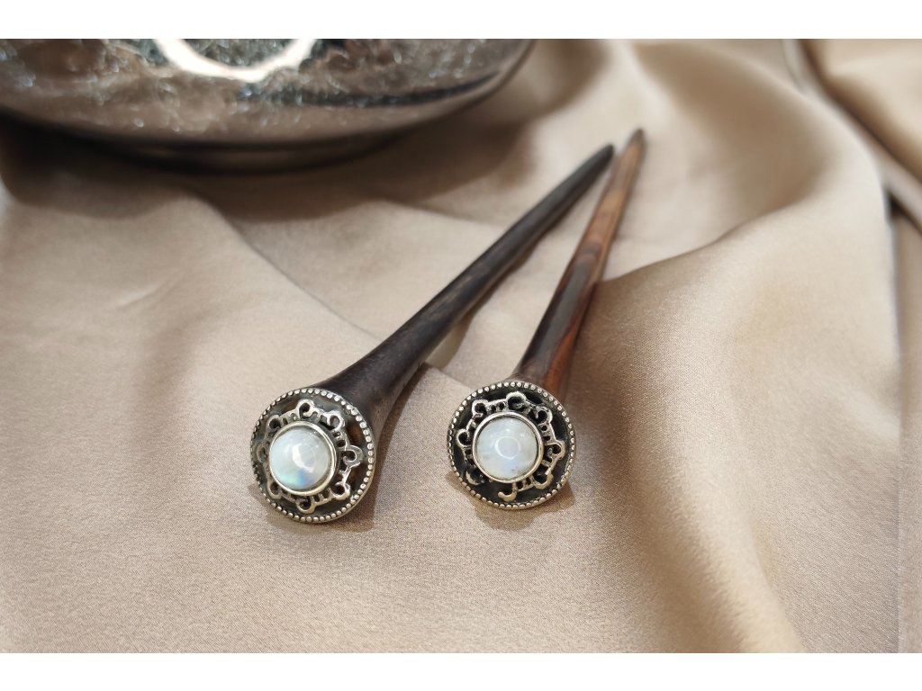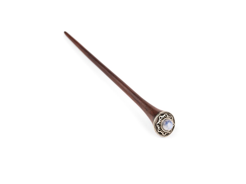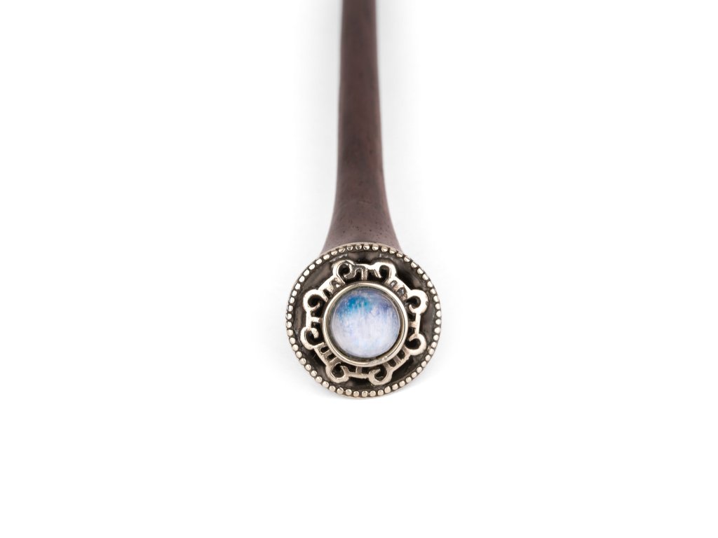 Táto vlasová palička bola navrhnutá pre elegantné ženy, ktoré sa snažia vylepšiť svoj štýl nádychom mágie a sofistikovanosti. Je zdobená mystickým mesačným kameňom, ktorý známy tým, že posilňuje intuíciu a vyrovnáva emócie, s ručne vyrobeným lemovaním z alpaky.